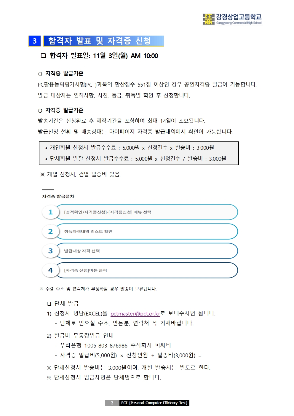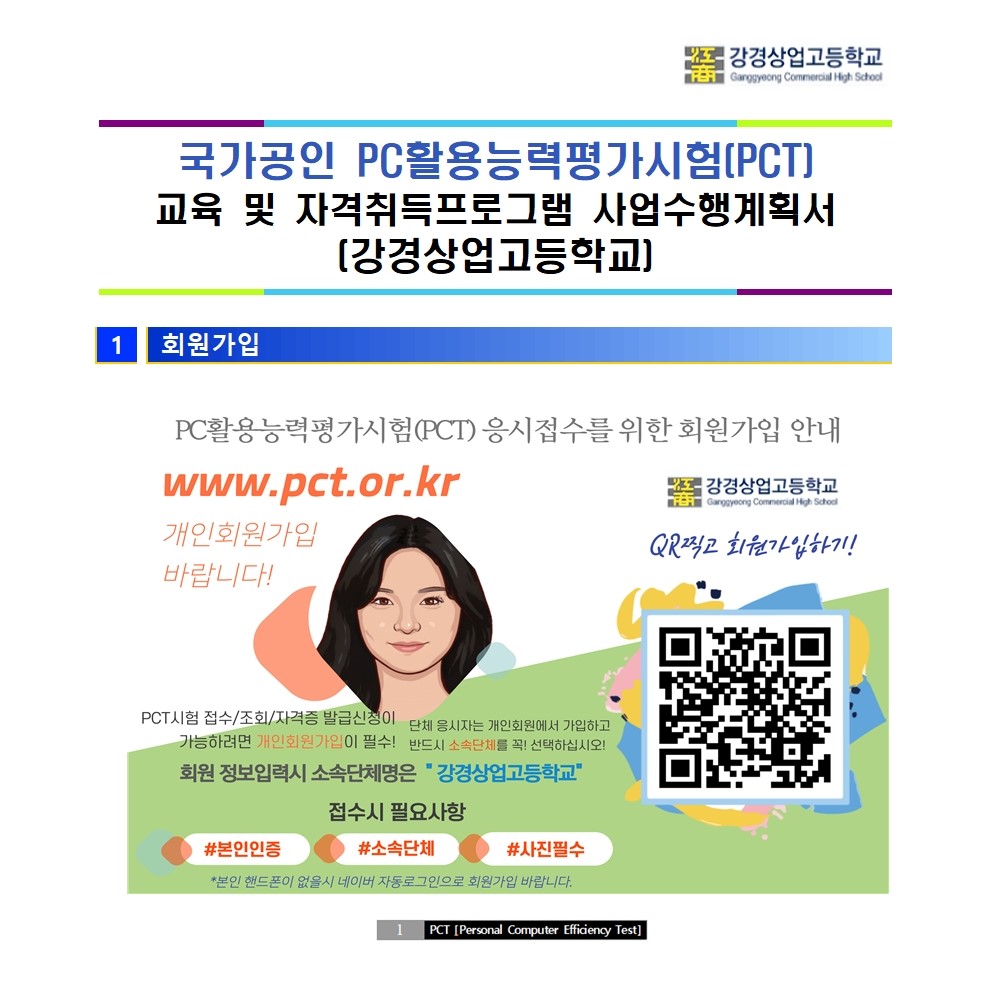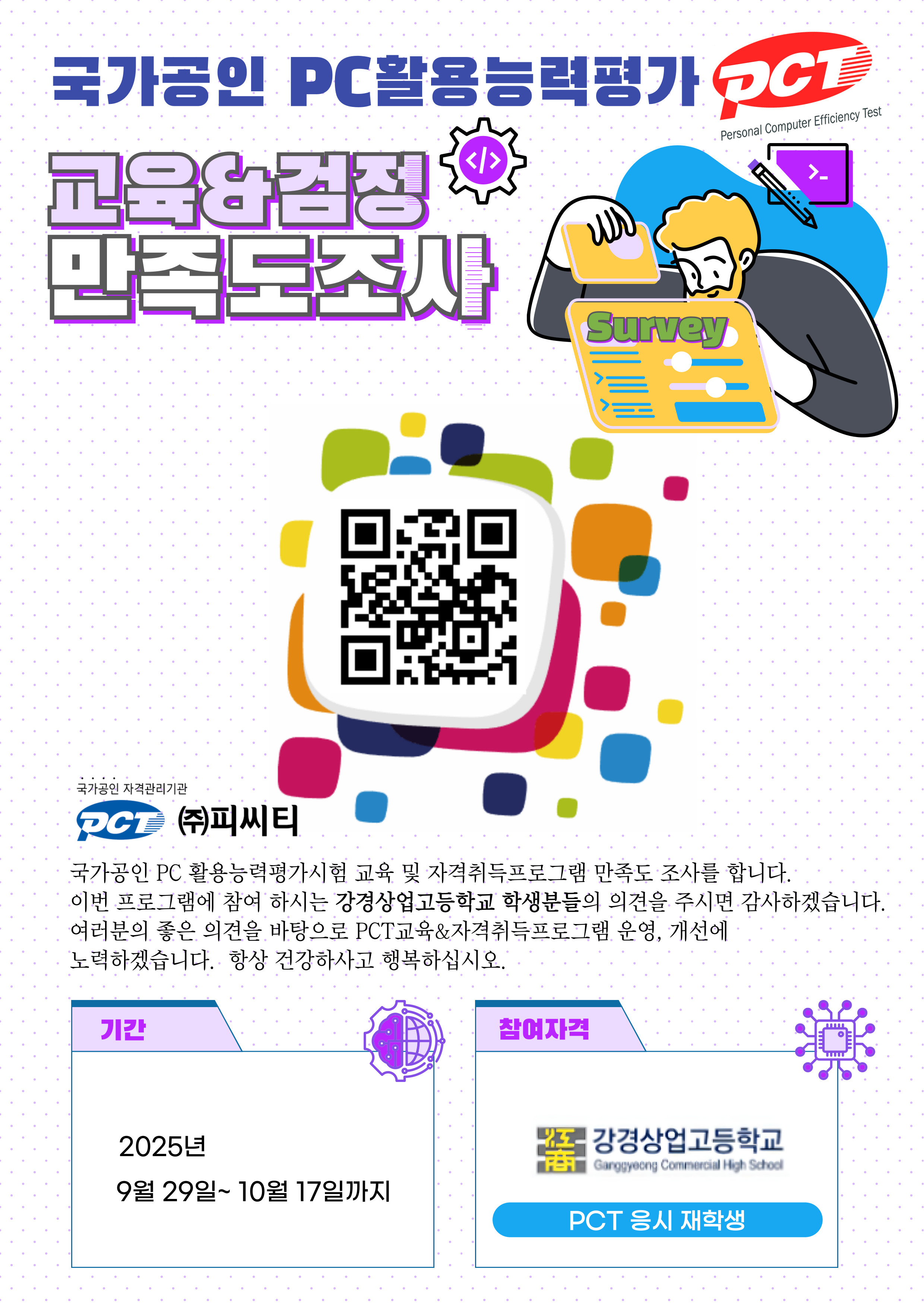 2025년 강경상업고등학교 재학생 대상 국가공인 PC활용능력평가시험(PCT)시험안내