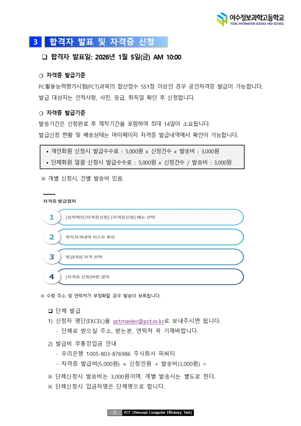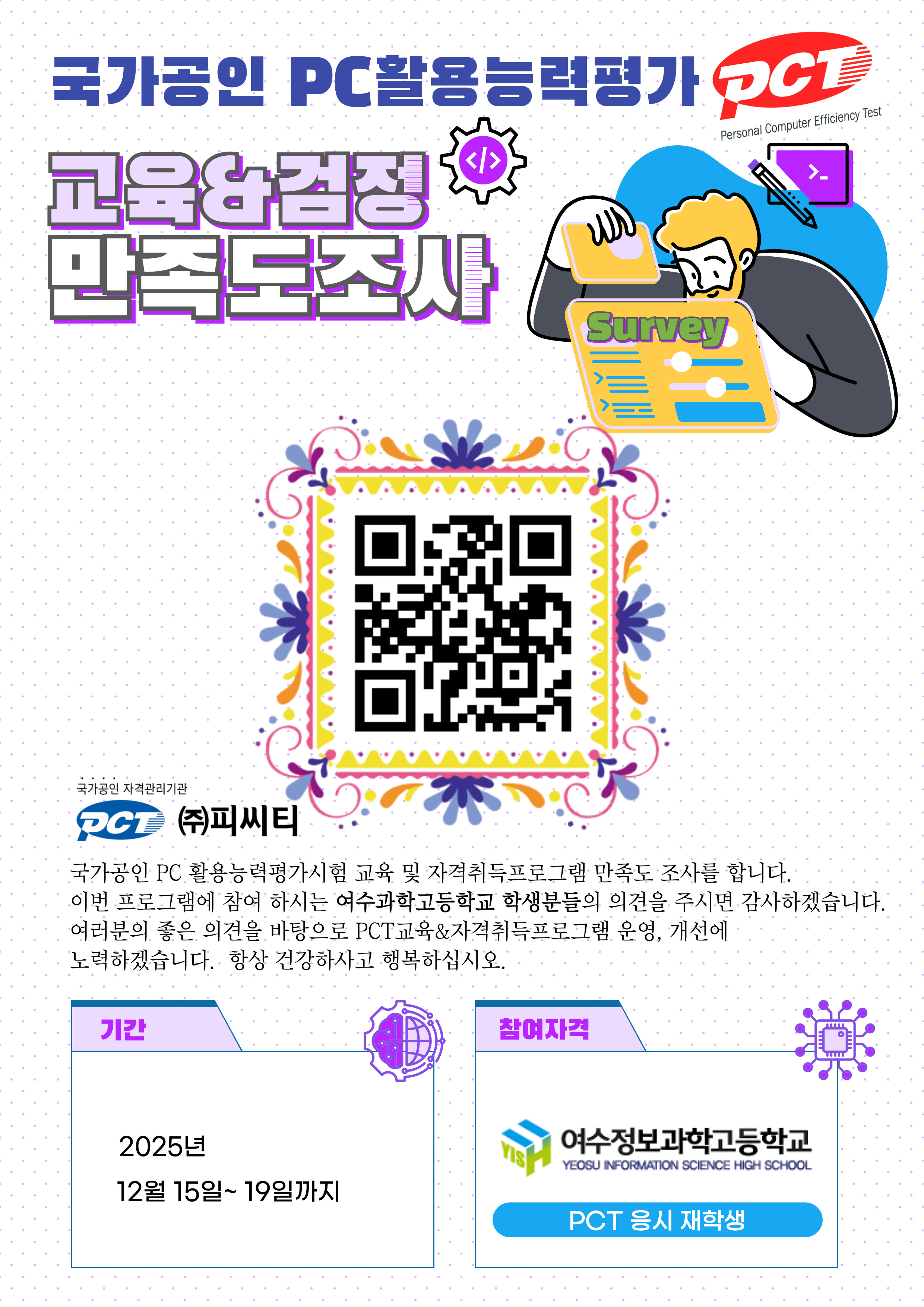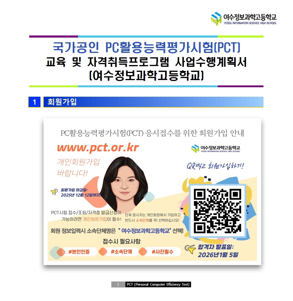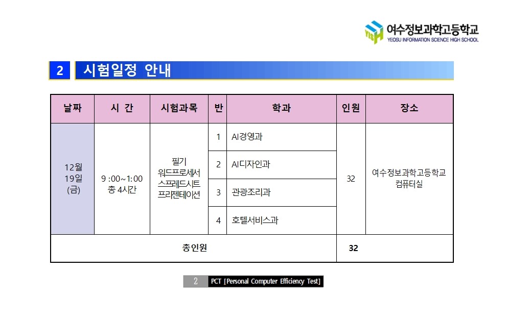 2025년 여수정보과학고등학교 재학생 대상 국가공인 PC활용능력평가시험(PCT)시험안내