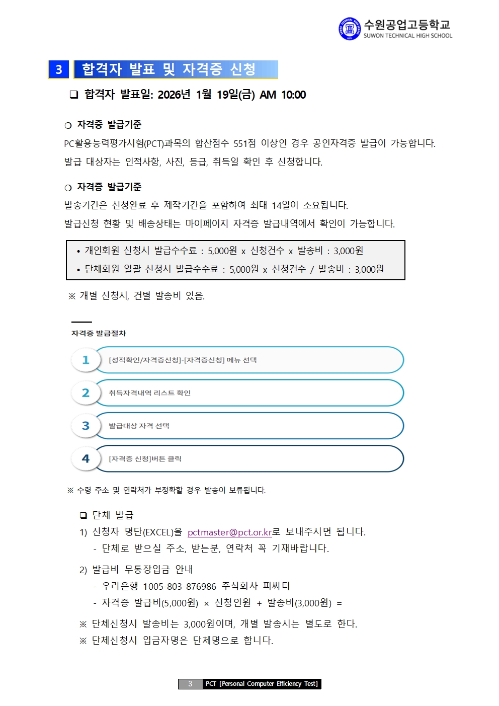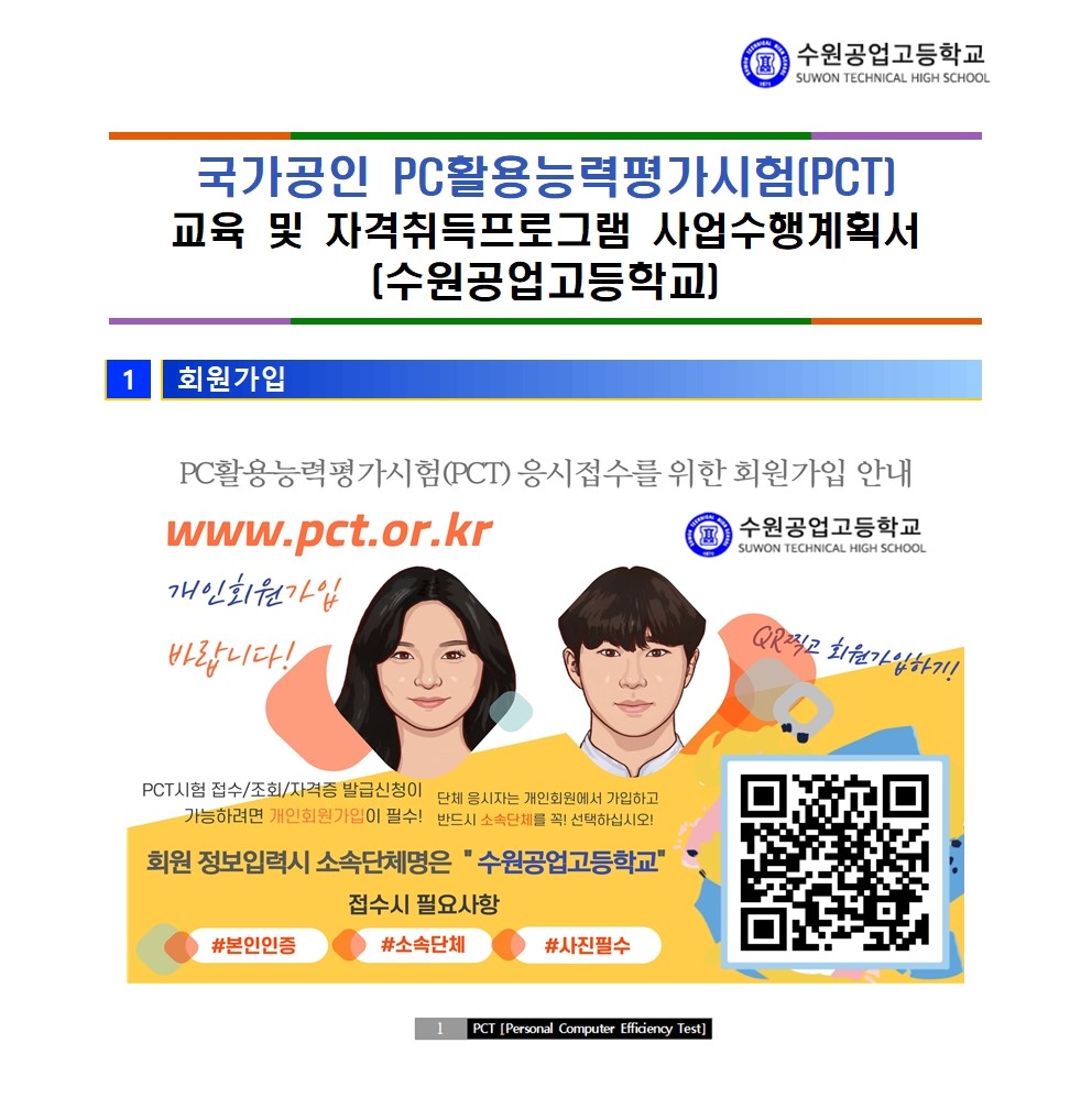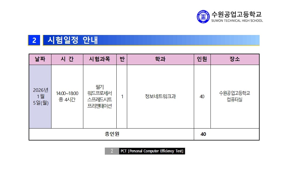 2026년 수원공업고등학교 재학생 대상 국가공인 PC활용능력평가시험(PCT)시험안내