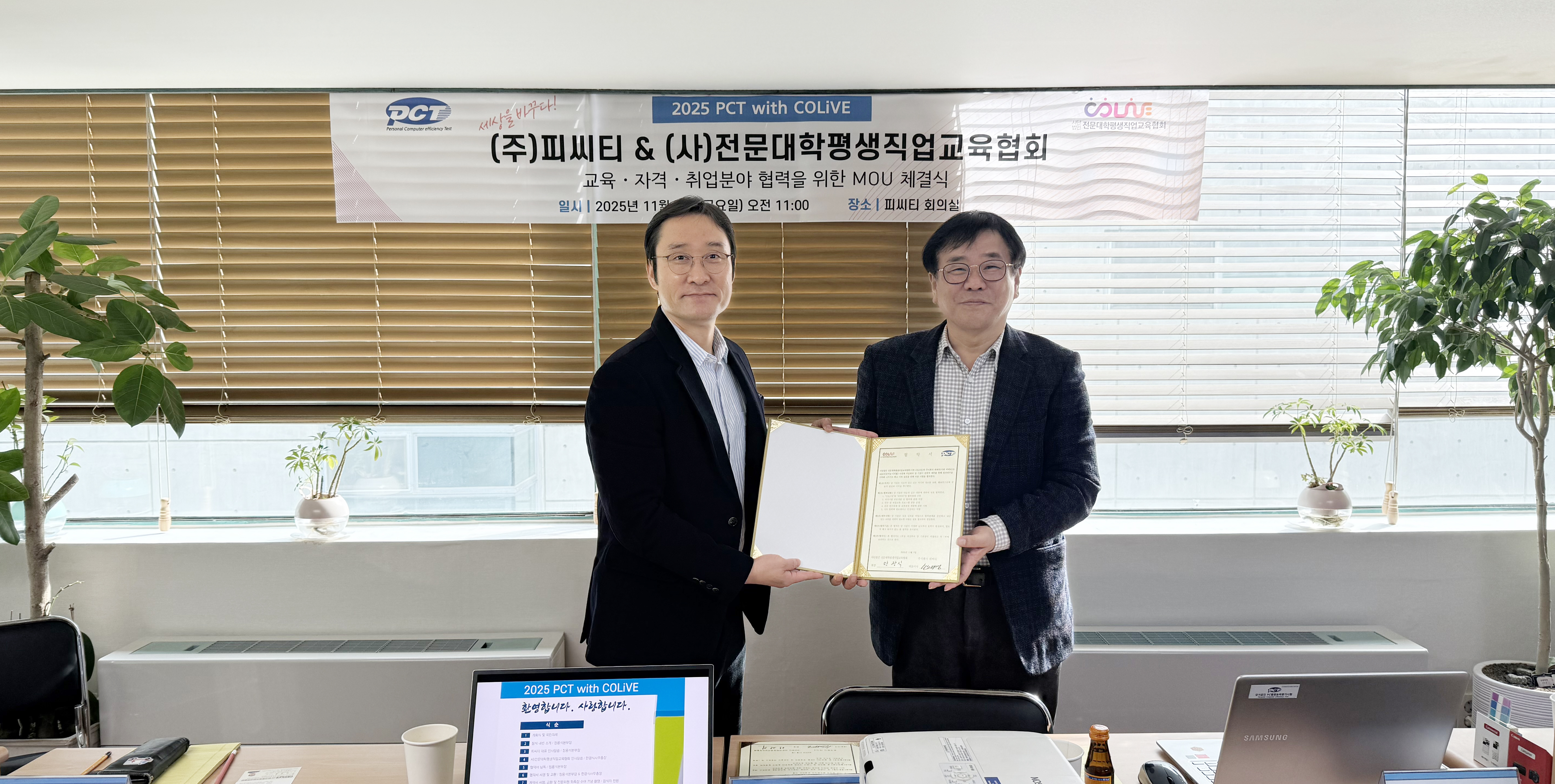 사)전문대학평생직업교육협회(COLiVE)와 (주)피씨티는 교육, 자격, 취업분야의 전략적 협력을 위해 MOU를 체결하고 초, 중고, 대학, 기업, 관공서 등에 공동으로 국가공인 PC활용능력평가시험(PCT)자격과 COLiVE에서 개발 운영하는는 다양한 교육과정 개설 및 평가인증사업에 대해 다각도로 협력하여 고객에게 양질의 교육 및 서비스를 제공할 예정입니다.