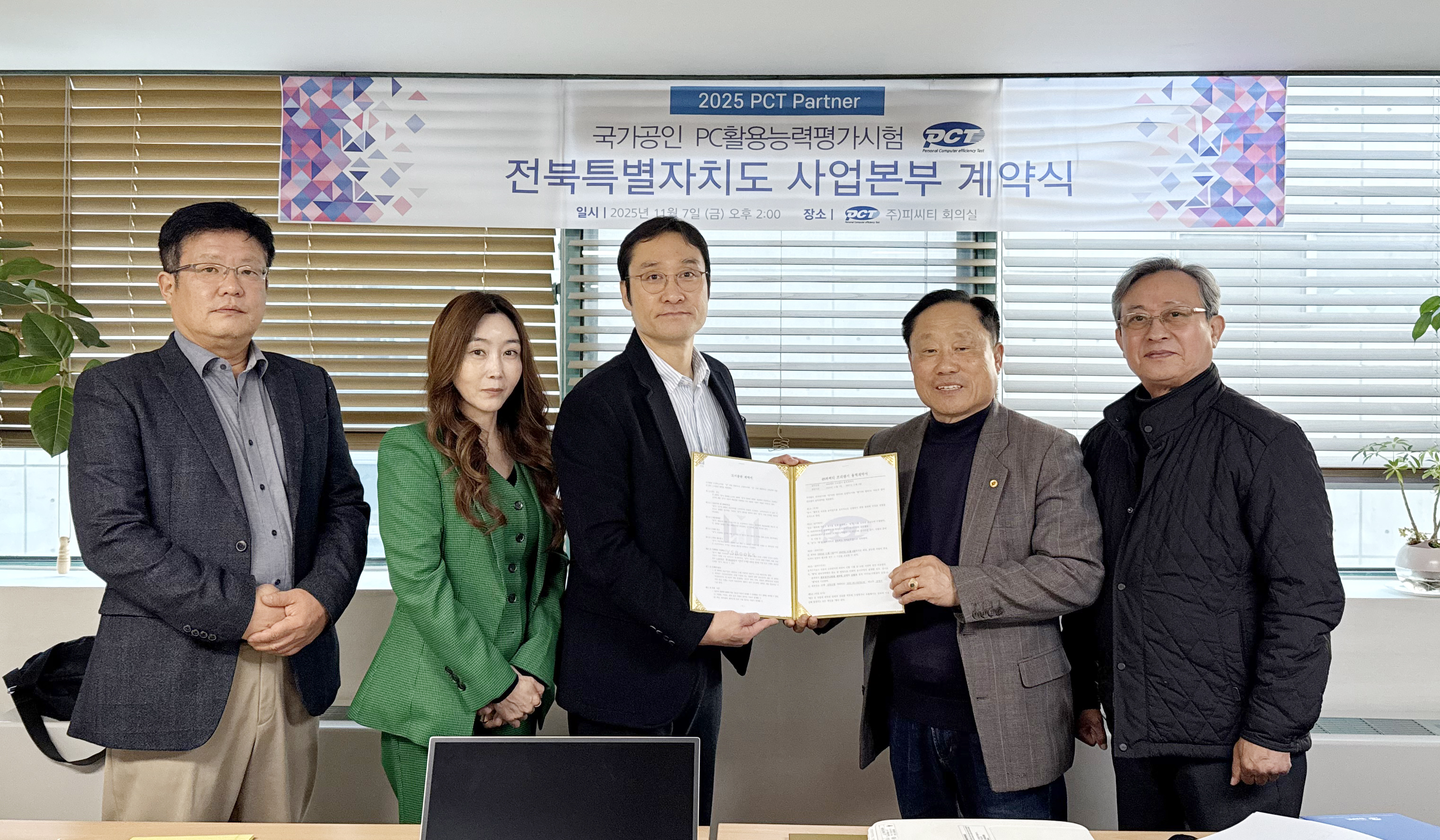 (주)피씨티는 국가공인 PC활용능력평가시험(PCT) 자격의 전북특별자치도의 응시생 편의 제공과, 시험활성화 위하여 아래와 같이 사업본부 계약을 체결하고, 고객에게 양질의 교육 및 자격 서비스를 제공할 예정입니다.